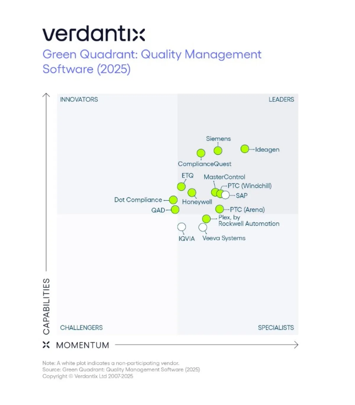 Siemens has been named a leader in the Green Quadrant: Quality Management Software 2025 report by research and advisory firm Verdantix.