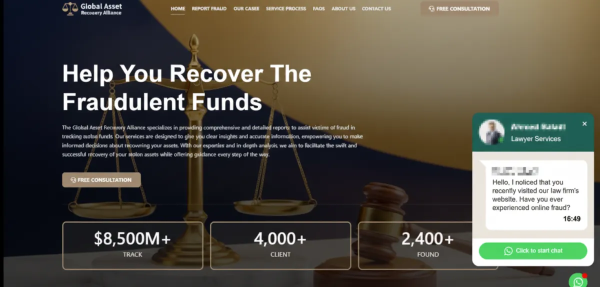 The investigation began after a major law firm discovered several websites using its name, branding, and publicly available staff identities. The pages posed as legitimate legal and asset-recovery services and invited visitors to contact the firm via phone, live chat, and WhatsApp. The contact details did not belong to the firm.
