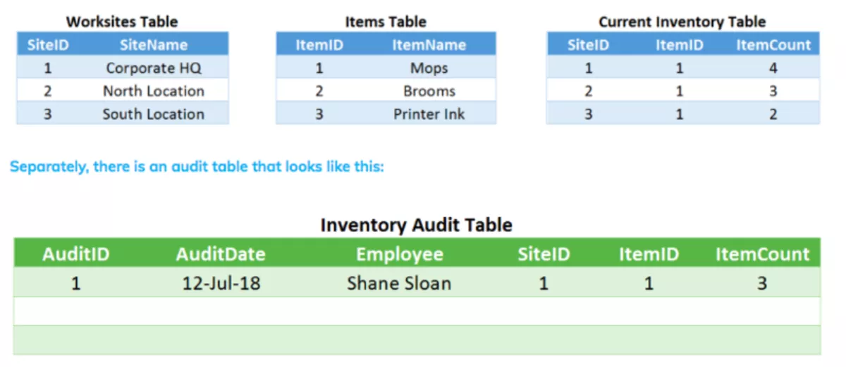 The employee is going to need to see the names of these items and worksites. Again, this can be solved with a view. However, when the employee wants to update the Inventory Audit Table, the view cannot be used and the original ID numbers will have to be entered.