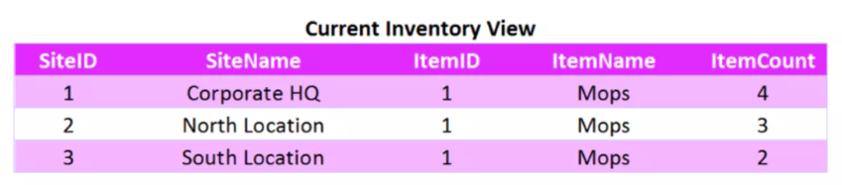 First, I recommend setting up views in the database that contain both the name fields as well as the ID fields. This is what the SQL tables might look like. For Worksites, Items, and Current Inventory.